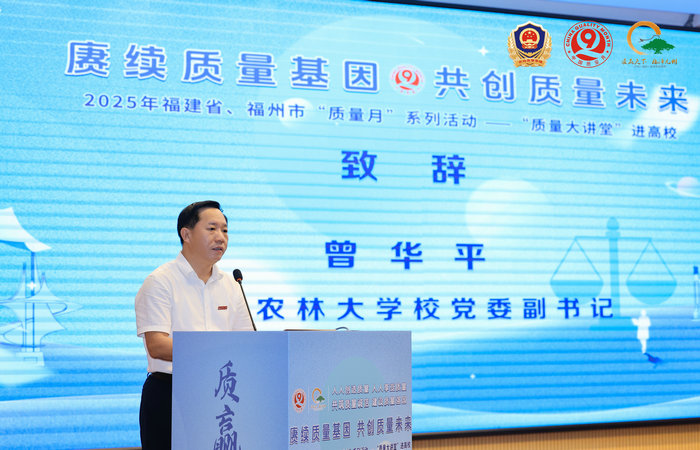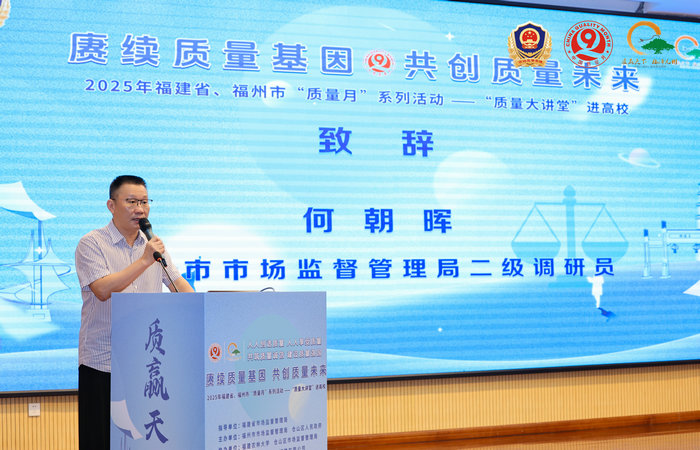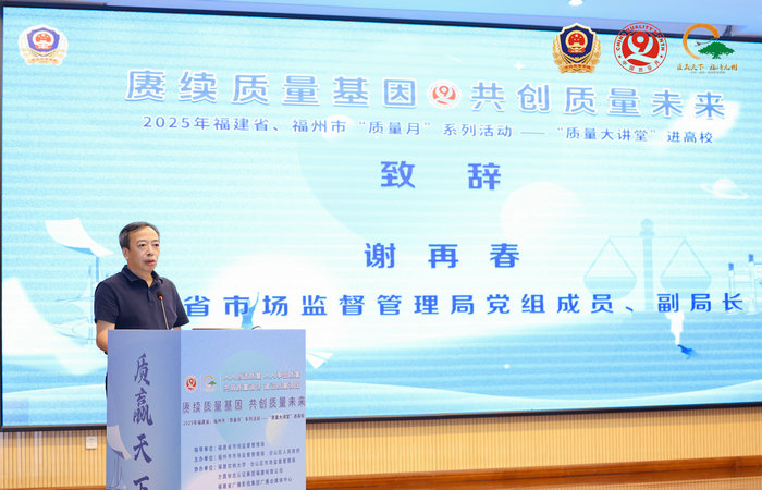 9月4日下午,由福建省市场监督管理局、福州市市场监督管理局、仓山区人民政府联合主办的2025年福建省“质量月”系列活动启动仪式暨“质量大讲堂”进高校活动在福建农林大学举行。此次活动以“赓续质量基因 共创质量未来”为主题,聚焦新质生产力与高质量发展,通过政策解读、企业分享、专家讲座等形式,推动质量意识深入校园,为质量强省建设注入青春动能。福建省市场监督管理局党组成员、副局长谢再春,福建农林大学党委副书记曾华平,福州市市场监督管理局二级调研员何朝晖出席活动并致辞。
