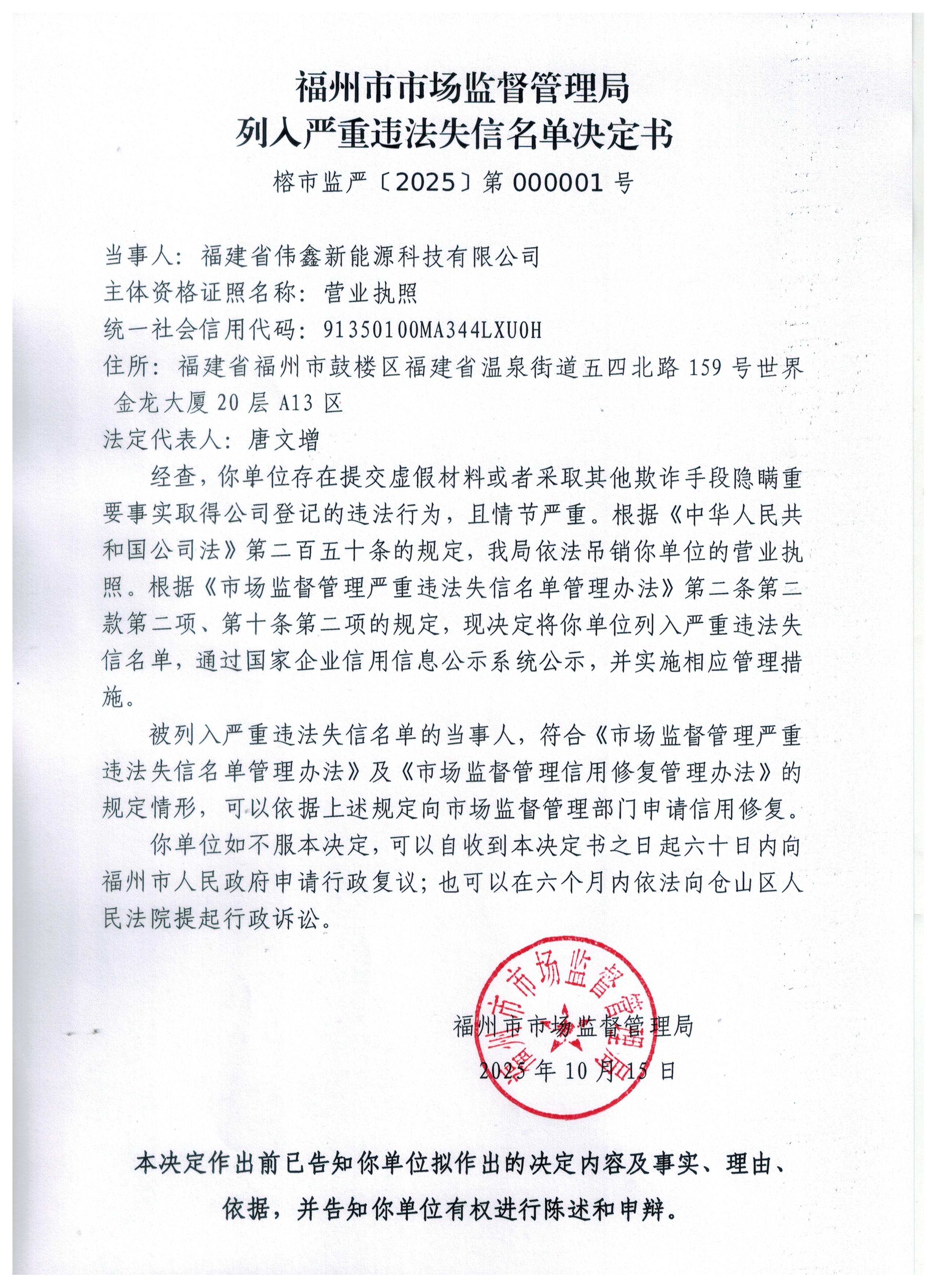 附件:福州市市场监督管理局列入严重违法失信名单决定书(榕市监严〔2025〕第000001号)