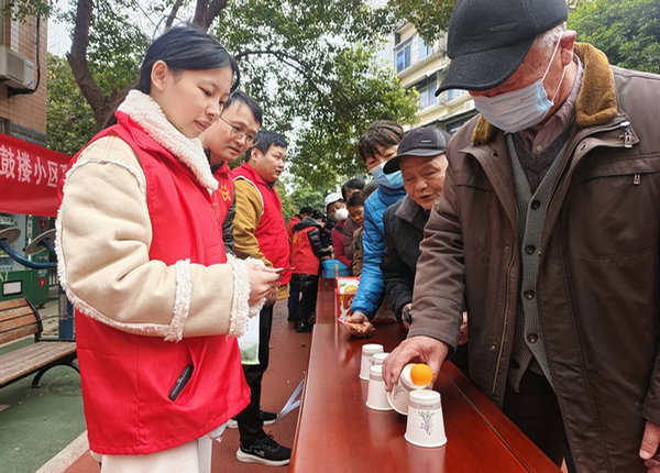 在一阵阵叫好声中,蕴含“孝顺”之意的福粥上场,党员志愿者们为老人们捧上一碗碗软糯香甜的拗九粥,与他们唠起家常。福粥入口,温情入心,现场弥漫着拗九粥的醇香,老人们脸上洋溢着孩童般的幸福笑容,大家连连说:“很甜,很温暖,吃得很开心!”除了送粥,现场还为六旬以上的老人准备了太平面和鸭蛋,寓意平平安安,幸福绵长!同时,志愿者们分组为小区的困难老人、行动不便的高龄老人入户送粥,真情关爱让老人们如沐春风。随后,党员志愿者们还向老人们进行移风易俗、平安建设、垃圾分类、反诈知识等精神文明宣传,让老人们感受到浓浓关怀。